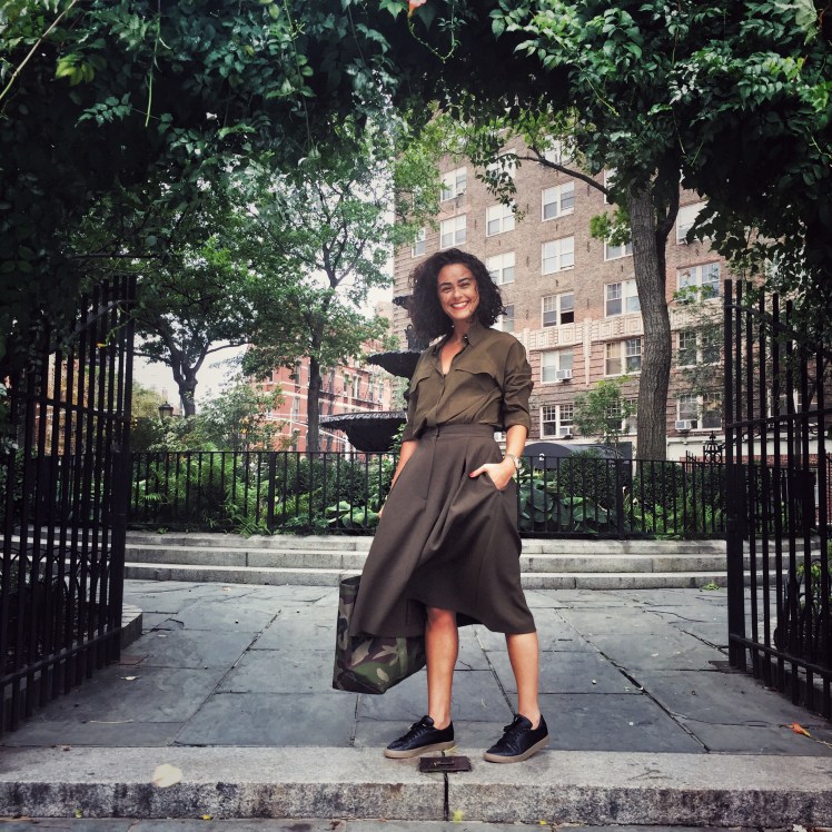 Combined different tones of greens together where the top is a silk blouse -a bit baggy with 80’s inspired skirt. When the shirt is tucked inside the skirt the fit on the waist kinda gives a fit for pullinv together two baggy pieces. They are both Academia by Beymen.